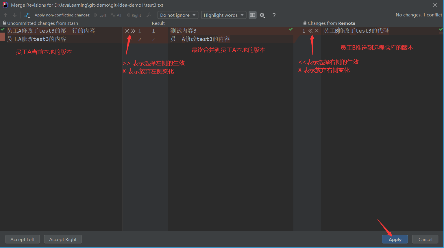 發(fā)生了沖突,因?yàn)閱T工A本地所做的修改是在員工B推送到遠(yuǎn)程倉(cāng)庫(kù)的前一版本的基礎(chǔ)上做的修改,而員工B的推送使得遠(yuǎn)程倉(cāng)庫(kù)的最新版本與員工A本地版本不同(很明顯員工B修改了test3文件,而員工A本地也在修改test3文件,如果貿(mào)然將遠(yuǎn)程倉(cāng)庫(kù)的代碼合并到員工A的本地,遠(yuǎn)程倉(cāng)庫(kù)的代碼很有可能覆蓋掉員工A當(dāng)前所做的修改,所以此時(shí)需要手動(dòng)處理沖突,選擇最終需要保留的部分)