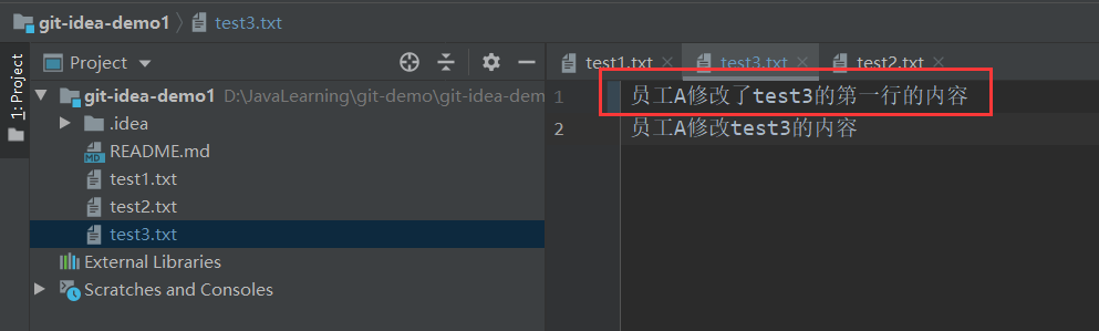 接下來(lái)員工A也修改了test3.txt文件,這次將原來(lái)的第一行內(nèi)容改變(此時(shí)員工A還沒(méi)有去拉取遠(yuǎn)程倉(cāng)庫(kù)的代碼),然后在提交修改之前員工A又去拉取遠(yuǎn)程倉(cāng)庫(kù)的代碼(提交自己的更改前拉取遠(yuǎn)程倉(cāng)庫(kù)代碼是一個(gè)好的習(xí)慣)