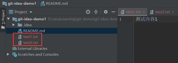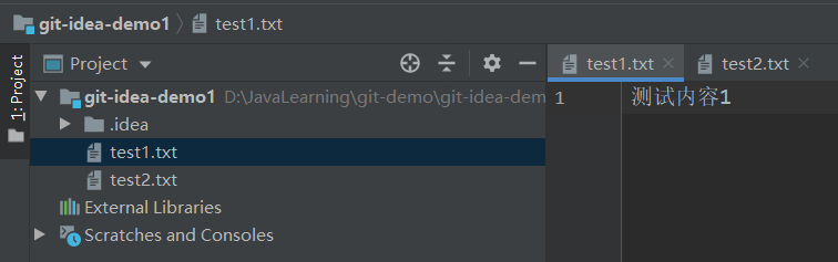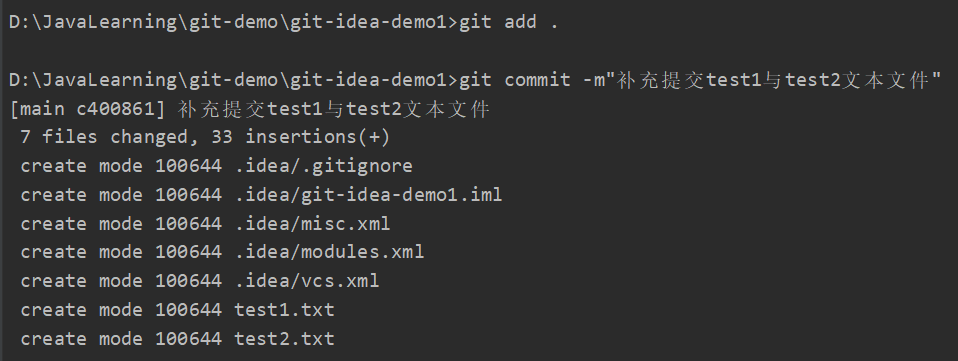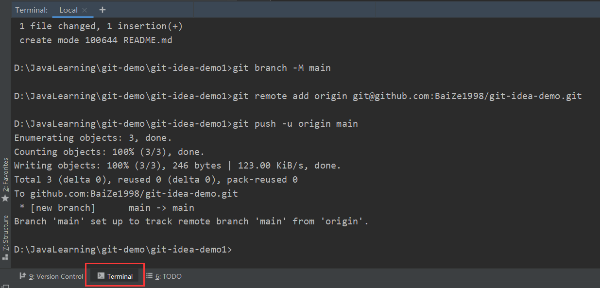 此時(shí)依舊在git-idea-demo1的文件夾內(nèi),在下方的終端輸入處輸入上述所有的命令,結(jié)束之后結(jié)果應(yīng)該與下圖相同
