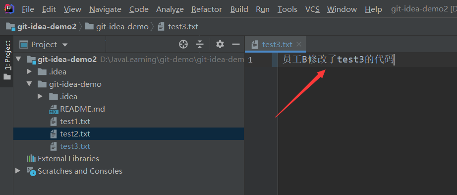 注意,雖然員工B在git-idea-demo2文件中用了克隆,但是git-idea-demo2中的git-idea-demo文件才是員工B本地倉(cāng)庫(kù)的存放文件(進(jìn)入之后看到.git文件在哪個(gè)文件夾內(nèi),哪個(gè)文件夾就是本地倉(cāng)庫(kù)文件夾)
