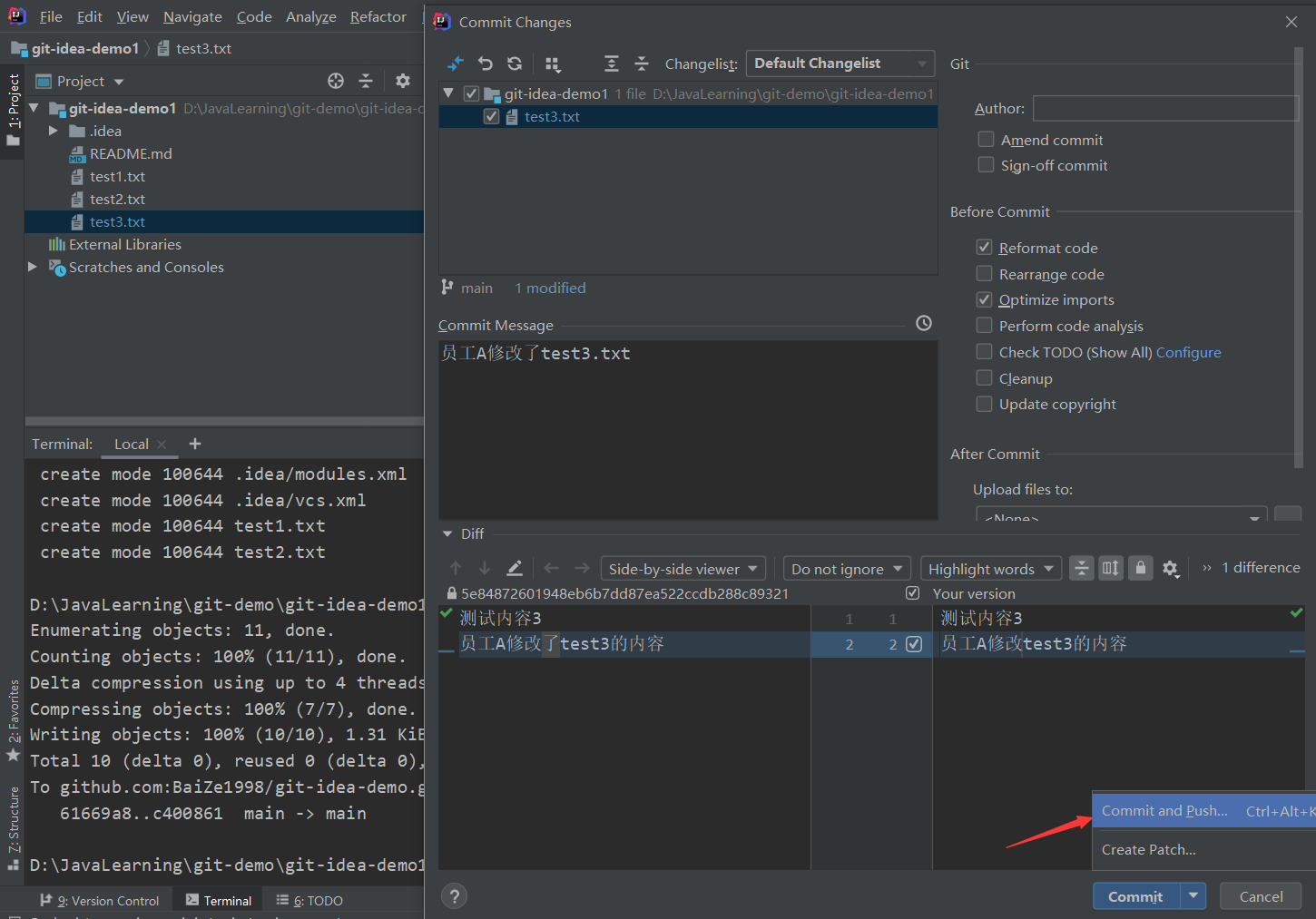 - 為了滿(mǎn)足情景,我們讓員工A修改一下test3.txt,然后推送到遠(yuǎn)程倉(cāng)庫(kù)