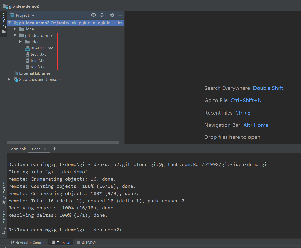 今天員工B被分配到員工A所在的小組參與開(kāi)發(fā),所以他首先要將小組當(dāng)前正在開(kāi)發(fā)的分支的項(xiàng)目代碼從遠(yuǎn)程倉(cāng)庫(kù)克隆到本地,首先用IDEA打開(kāi)git-idea-demo2文件夾,在終端Terminal處輸入git clone 遠(yuǎn)程倉(cāng)庫(kù)的地址將整個(gè)項(xiàng)目拷貝到git-idea-demo2文件夾內(nèi)