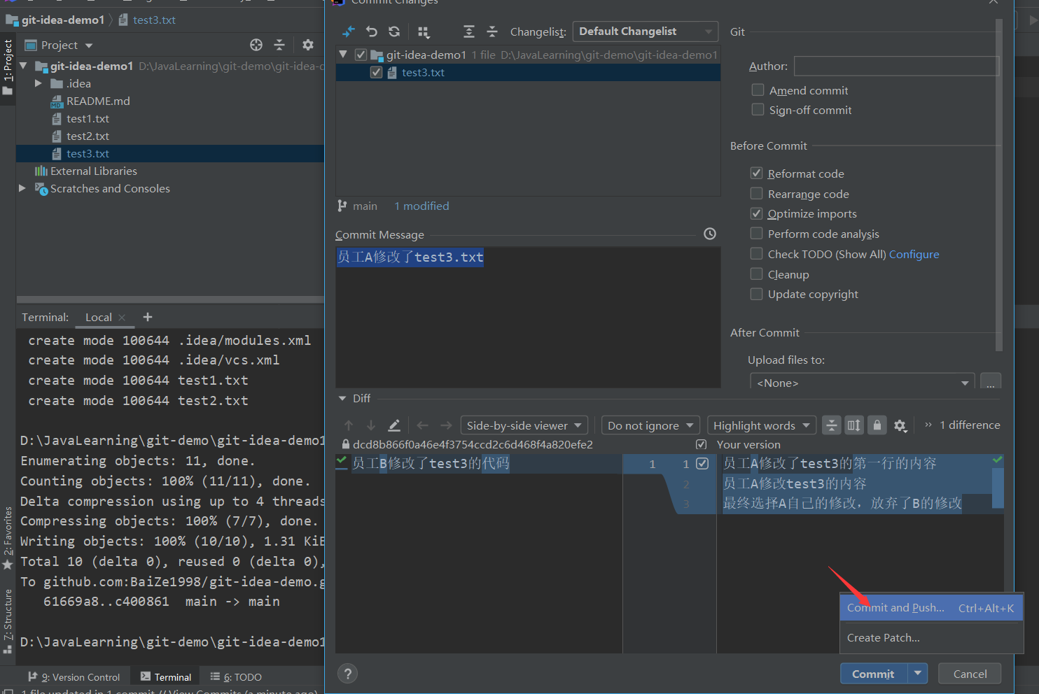 員工B修改了test3的代碼,并且執(zhí)行添加->提交->推送