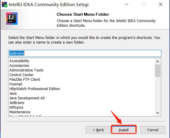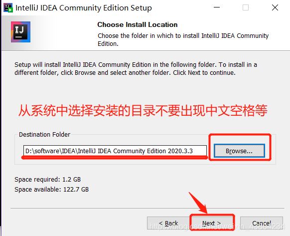當(dāng)前頁面是選擇IDEA的安裝路徑,可參照下圖設(shè)置,注意目錄不要出現(xiàn)中文、空格