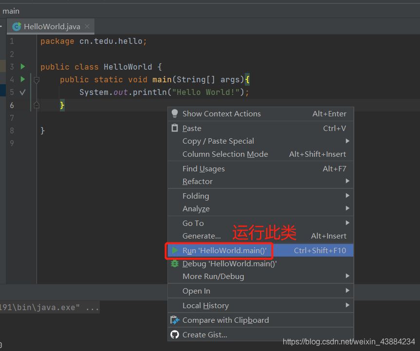 10.運行程序,空白處右鍵,選擇”Run ‘HelloWorld.main()'”運行程序
