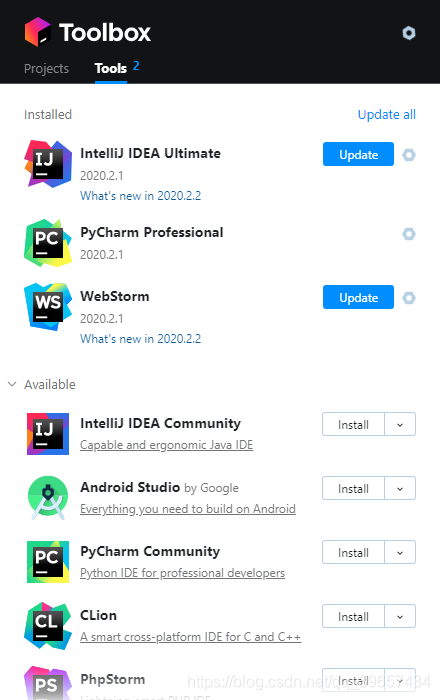 當(dāng)然你也可以安裝Toolbox App, 在這里面可以下載Jetbrains里的一系列軟件, 網(wǎng)速就稍微快點(diǎn)了, 管理更新也很方便。