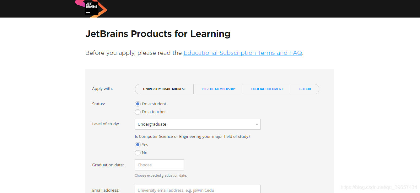 2.進(jìn)入 https://www.jetbrains.com/shop/eform/students , 開(kāi)始填寫(xiě)資料。(有時(shí)候Jetbrains官網(wǎng)相應(yīng)的比較慢~請(qǐng)耐心等待)