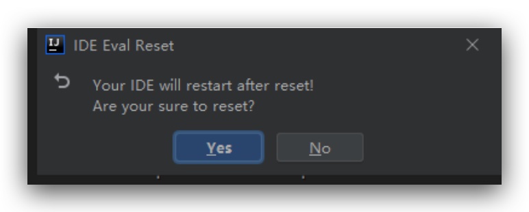 按鈕:Reset 點(diǎn)擊會(huì)詢問(wèn)是否重置試用30天并重啟IDE。選擇Yes則執(zhí)行重置操作并重啟IDE生效,選擇No則什么也不做。(此為手動(dòng)重置方式)