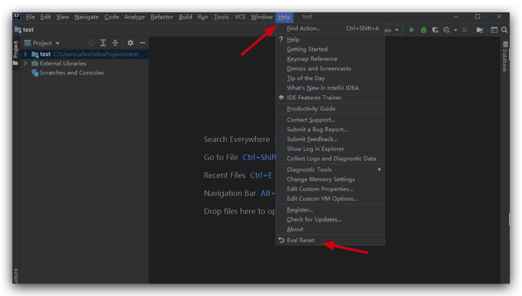 如果IDE沒(méi)有打開(kāi)項(xiàng)目,在Welcome界面點(diǎn)擊菜單:Get Help -> Eval Reset如果IDE打開(kāi)了項(xiàng)目,點(diǎn)擊菜單:Help -> Eval Reset