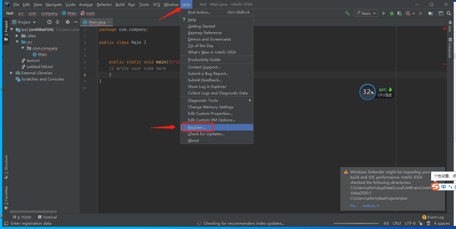 進(jìn)入 IDEA 界面后,點(diǎn)擊 Help -> Register 查看: