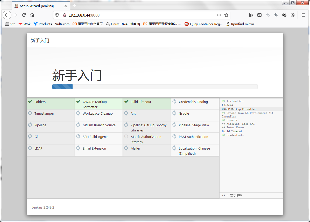提示:這里我們耐心等待插件全部安裝好;這里安裝插件和本地服務(wù)器網(wǎng)絡(luò)有關(guān),如果在這一步插件有些沒有安裝成功,可以重試,或者直接到j(luò)enkins主頁里面的插件管理里面找到對應(yīng)的插件,安裝即可;