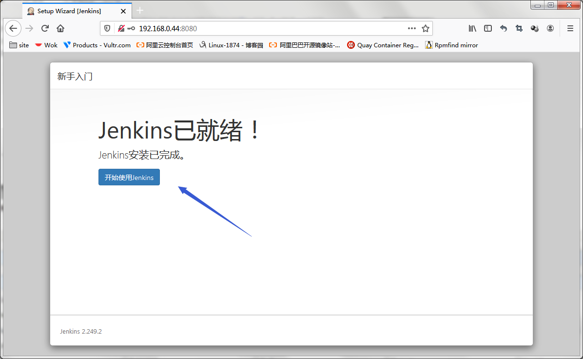 提示:到此jenkins就安裝好了;我們可以點(diǎn)擊開始使用jenkins,看看jenkins的首頁;