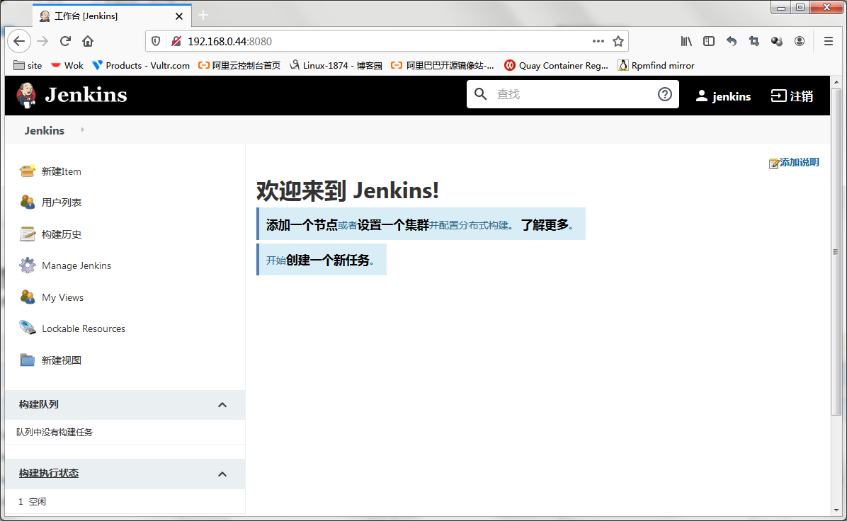 好了jenkins首頁就長這樣,到此jenkins的初始化配置就完成了;后續(xù)我們可以在里面用到什么功能再下載相應(yīng)的插件,配置對應(yīng)的功能就好;