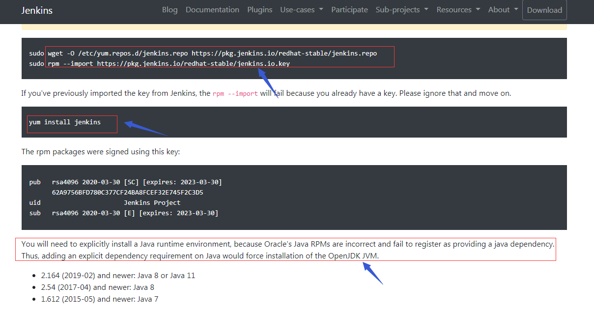 提示:官方告訴我們說,配置jenkins的倉庫,然后使用yum install jenkins 命令來安裝jenkins;并且官方建議使用openjdk;