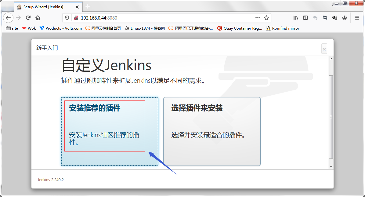 提示:這里提示我們把上面輸入管理員密碼;這個(gè)管理員密碼默認(rèn)保存在/var/lib/jenkins/secrets/initialAdminPassword,我們把密碼復(fù)制過來貼到此處就好;