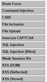 暴力(破解)、命令行注入、跨站請(qǐng)求偽造、文件包含、文件上傳、不安全的驗(yàn)證碼、SQL注入、SQL盲注、弱會(huì)話ID、XSS漏洞(DOM型跨站腳本、反射型跨站腳本、 存儲(chǔ)型跨站腳本)