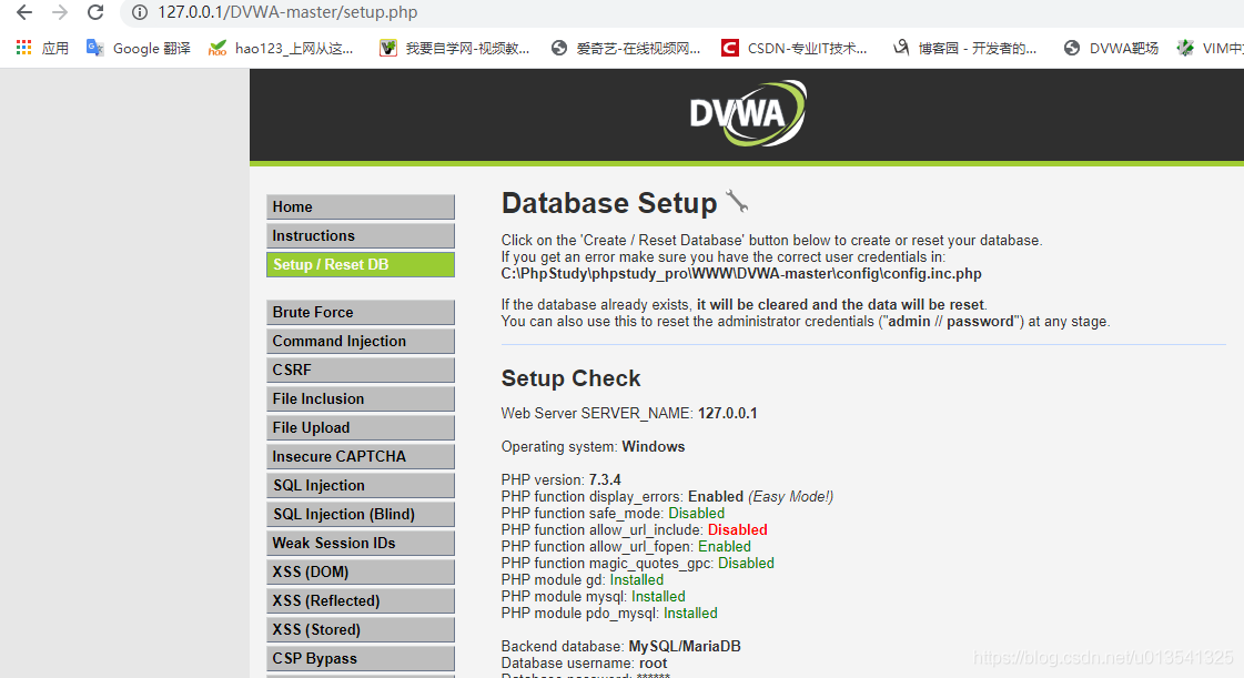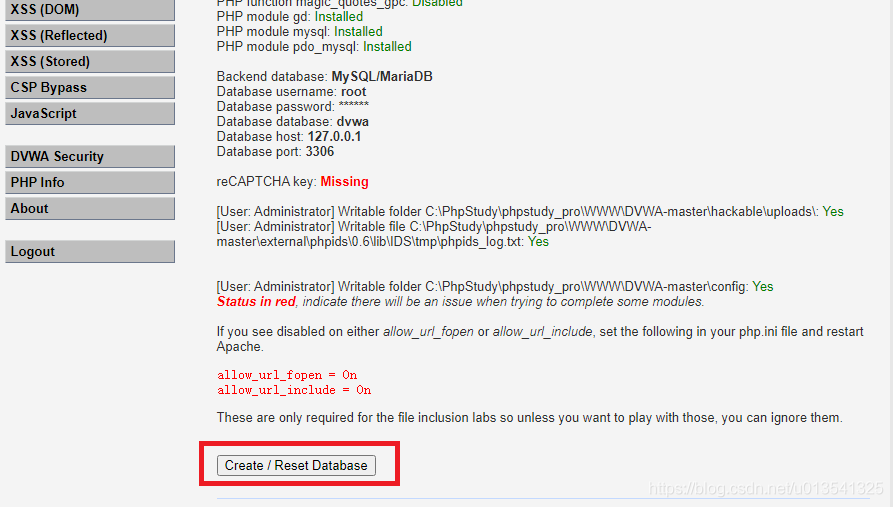 瀏覽器只需要直接打開(kāi)“http://127.0.0.1/DVWA-master/setup.php”即可!如果有”標(biāo)紅“提示,可能你要打開(kāi)一些模塊或做一些設(shè)置,否則有些是不能實(shí)驗(yàn)的,例如:文件包含、文件上傳漏洞。