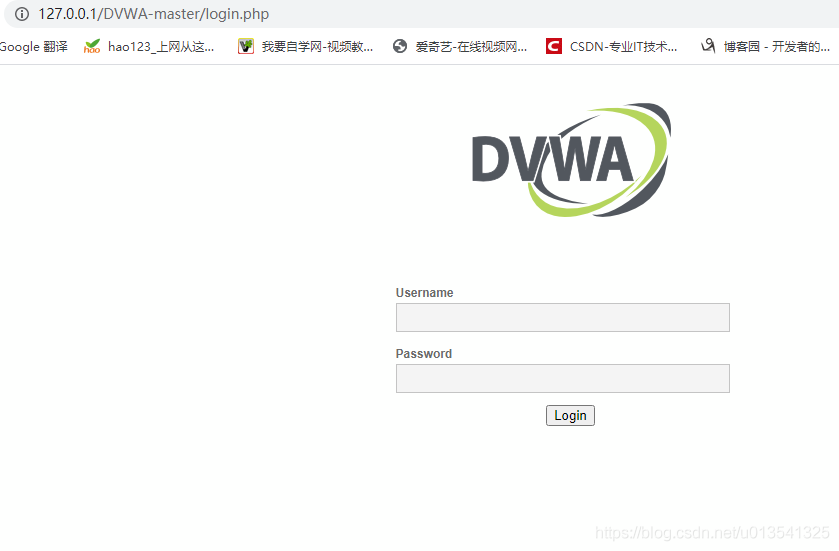 瀏覽器打開(kāi)”http://127.0.0.1/DVWA-master/login.php“登陸。默認(rèn)用戶名:admin,默認(rèn)密碼:password;