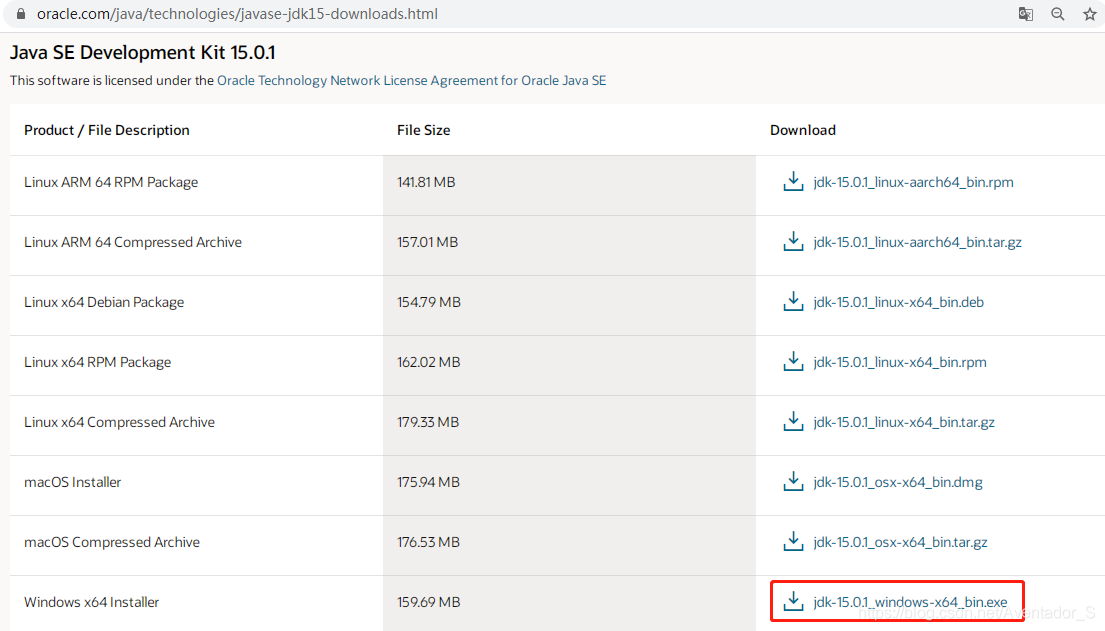 進入網(wǎng)址 https://www.oracle.com/java/technologies/javase-jdk15-downloads.html ,下載文件 jdk-15.0.1_windows-x64_bin.exe