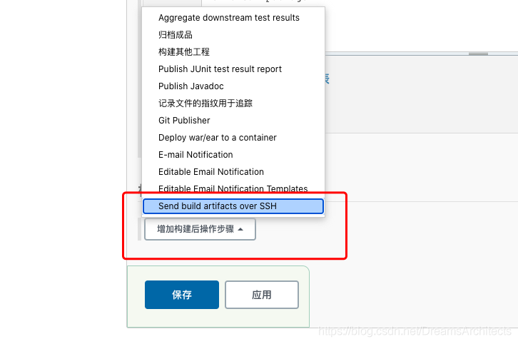 配置工程 --》增加構(gòu)建后操作步驟 選擇Sned build artifacts over SSH