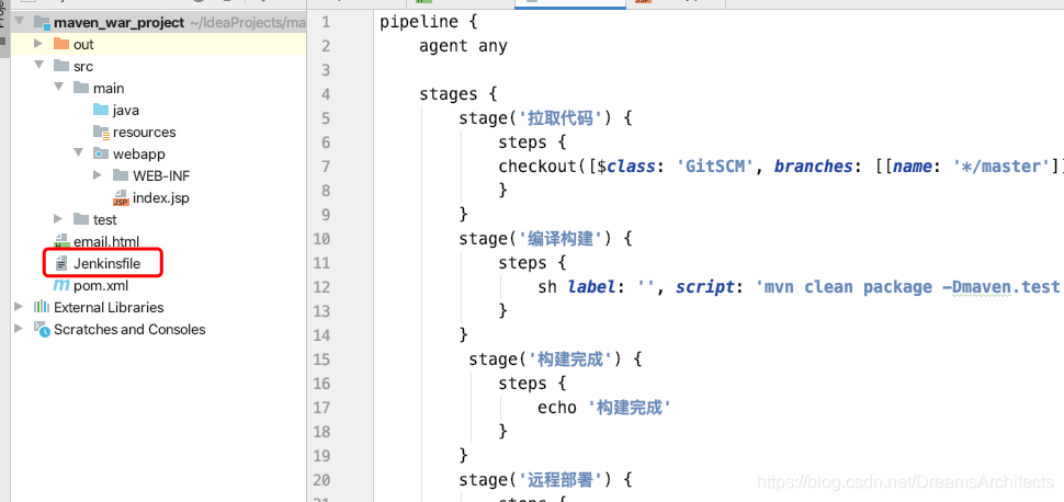 在項(xiàng)目中(一起進(jìn)行版本控制) 1)在項(xiàng)目根目錄建立Jenkinsfile文件,把內(nèi)容復(fù)制到該文件中