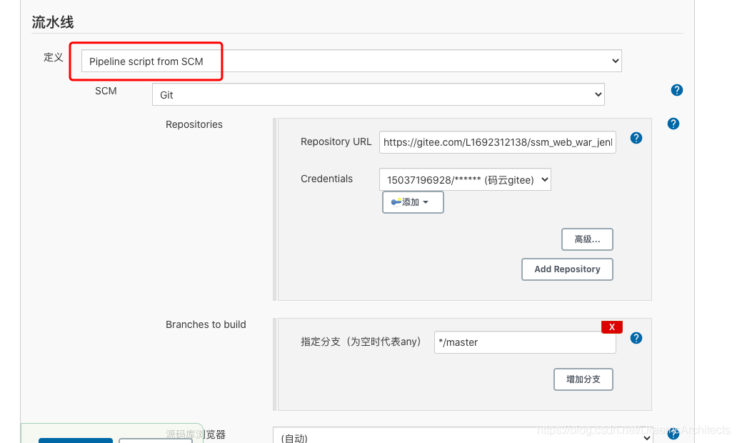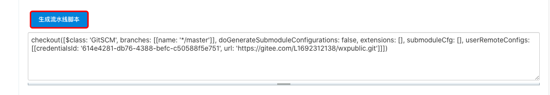 checkout([$class: 'GitSCM', branches: [[name: '*/master']], doGenerateSubmoduleConfigurations: false, extensions: [], submoduleCfg: [], userRemoteConfigs: [[credentialsId: '614e4281-db76-4388-befc-c50588f5e751', url: 'https://gitee.com/L1692312138/ssm_web_war_jenkins.git']]])