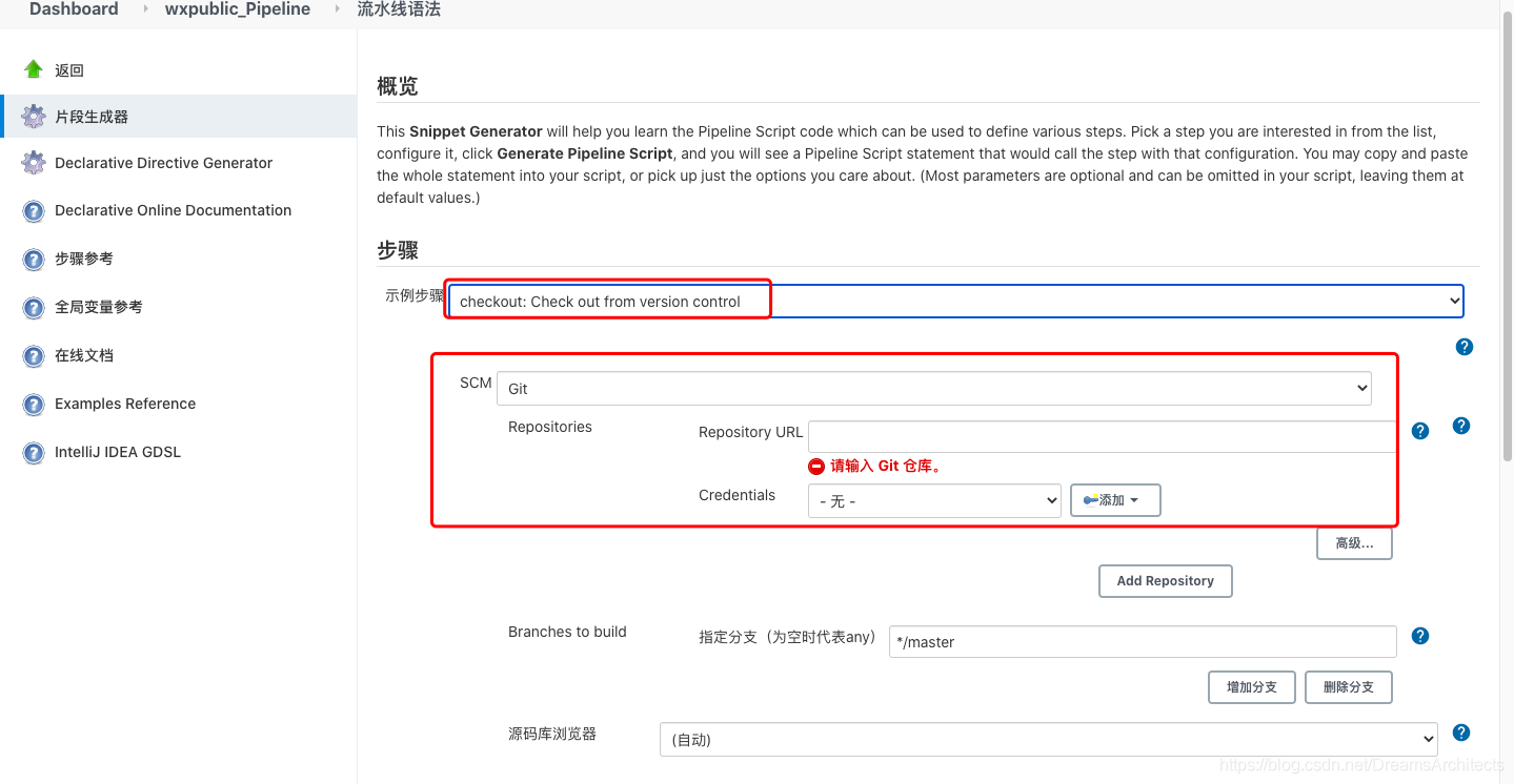 剛才我們都是直接在Jenkins的UI界面編寫Pipeline代碼,這樣不方便腳本維護(hù),建議把Pipeline腳本放