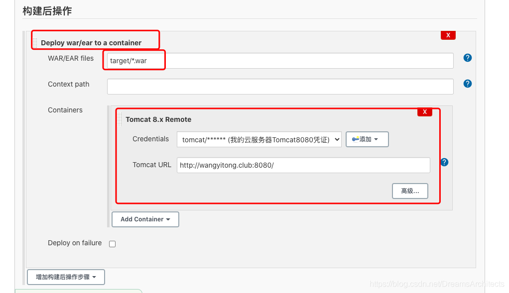 deploy adapters: [tomcat8(credentialsId: 'a2672517-c02b-4f62-ab3c-e6f70d08b98e', path: '', url: 'http://wangyitong.club:8080/')], contextPath: null, war: 'target/*.war'