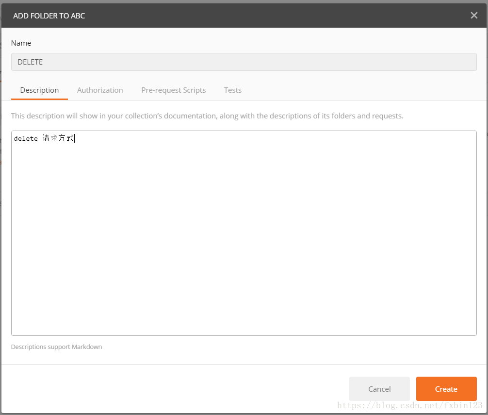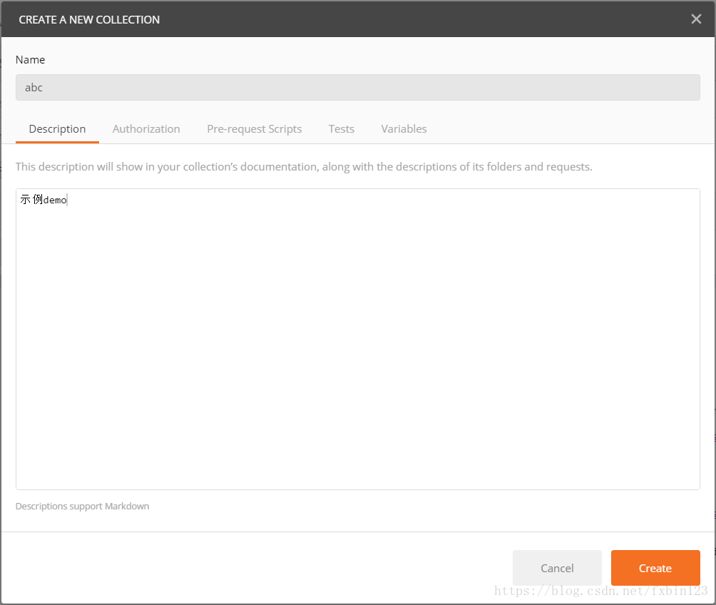 點(diǎn)擊上圖中的帶+號(hào)的圖標(biāo),輸入Name:”abc”,Description:”示例demo”,點(diǎn)擊Create按鈕即創(chuàng)建成功一個(gè)Collections.