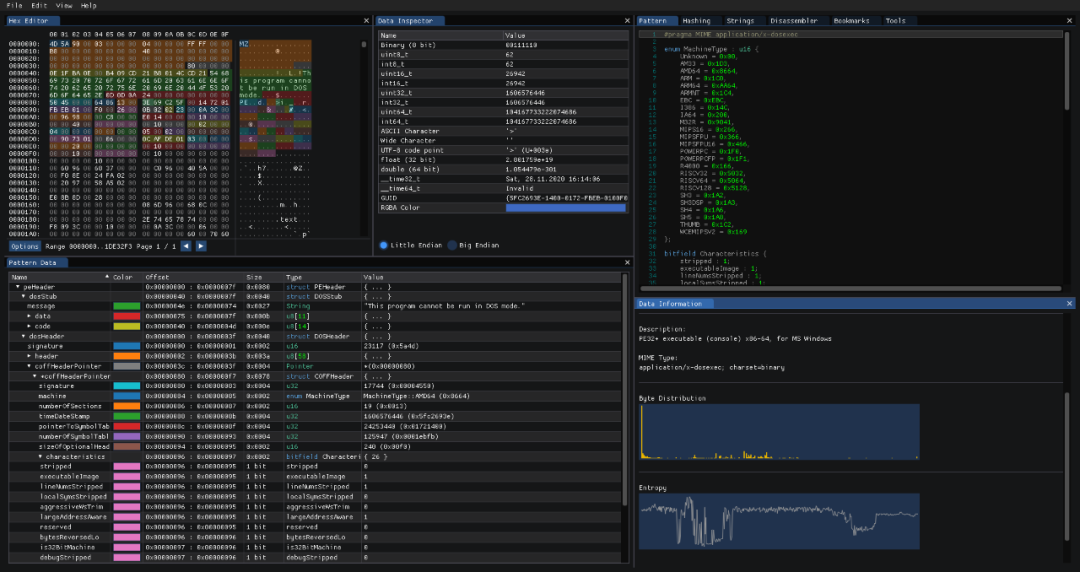 每款編輯器都有自己的風(fēng)格,越來(lái)越多的開(kāi)發(fā)者青睞于黑色背景、彩色高亮顯示的界面風(fēng)格,ImHex 就是如此: