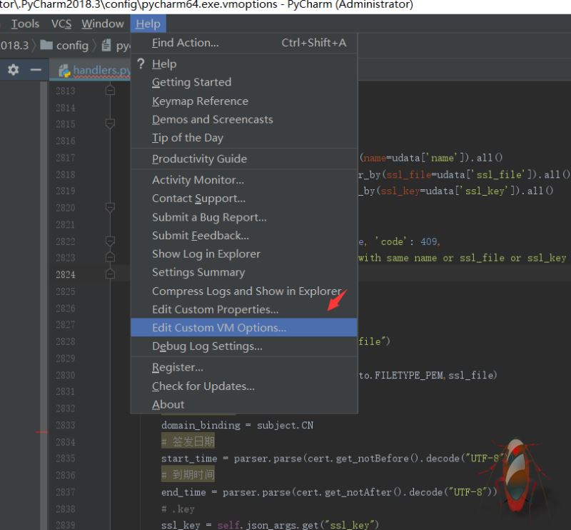 進(jìn)入到項目界面后,點擊Idea最上面的菜單欄中的 “Help” -> “Edit Custom VM Options …”,如果提示是否要創(chuàng)建文件,請點”Yes”。