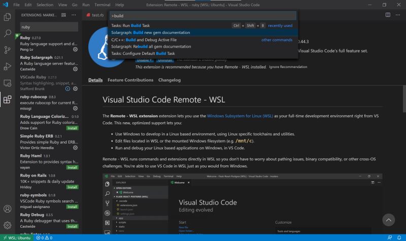 到此這篇關(guān)于VSCode + WSL 2 + Ruby環(huán)境搭建圖文詳解的文章就介紹到這了,更多相關(guān)VSCode WSL 2 Ruby環(huán)境搭建內(nèi)容請搜索腳本之家以前的文章或繼續(xù)瀏覽下面的相關(guān)文章希望大家以后多多支持腳本之家!