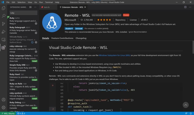 vscode近年來發(fā)展迅速,幾乎在3年之間就搶占了原來vim、sublime text的很多份額,猶記得在2015-2016年的時(shí)候,ruby推薦的開發(fā)環(huán)境基本上都是vim和sublime text,然而,隨著vscode的發(fā)展,vscode下ruby的開發(fā)體驗(yàn)已經(jīng)非常不錯(cuò)?,F(xiàn)在基本上使用win 10 wsl2 + vscode + windows terminal的體驗(yàn)已經(jīng)不遜于mac + vim (sublime) + item 2的體驗(yàn)了