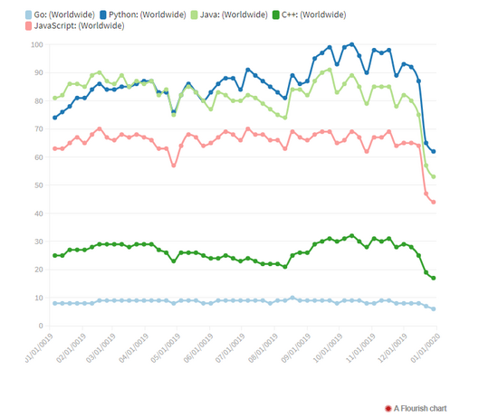 研究人員決定查看一些GitHub的統(tǒng)計數(shù)據(jù),以了解哪些語言使用得最多。根據(jù)GitHut 2.0, Python和Go位列2019年五大語言之列。