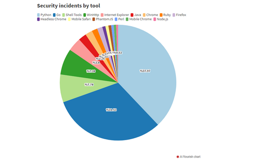 為了了解這些工具在研究人員保護的網(wǎng)站上攻擊的傳播情況,研究人員創(chuàng)建了一個圖表,顯示2019年每種工具攻擊的網(wǎng)站百分比。研究人員觀察到的工具在事件數(shù)量和被攻擊站點的百分比方面都處于領先地位。大多數(shù)站點每個月都會受到Python的攻擊,而30%-50%的站點會受到其他工具的攻擊。