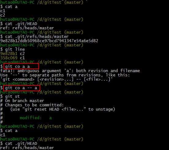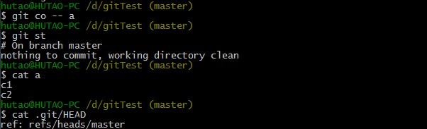 在檢出a分支下的a文件的時候,最好把兩個連字符加上,不然git也會無法區(qū)分。整個過程中,HEAD頭指針沒有發(fā)生改動。