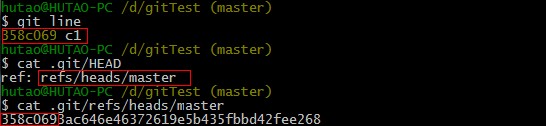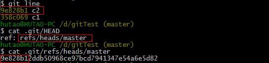 我們看到c1的提交hash值和HEAD對應(yīng)分支master的當(dāng)前hash值是一樣的。也就是說,HEAD指向的是當(dāng)前分支名master,而master又對應(yīng)了當(dāng)前的最新的一次提交ID.