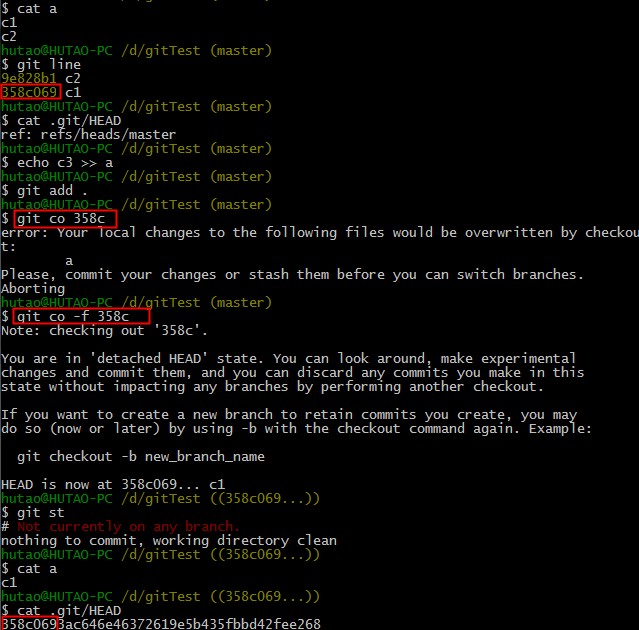 接下來,我們看看用法2,在第一部分中,我們知道切換分支,會改變HEAD的指向,那么如果我們是檢出某個commit會怎樣呢?同檢出分支一樣,會用該commit下的內(nèi)容覆蓋當(dāng)前分支工作區(qū)和暫存區(qū)的內(nèi)容,請看例子。