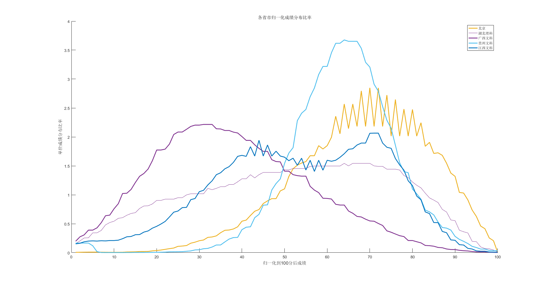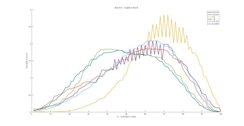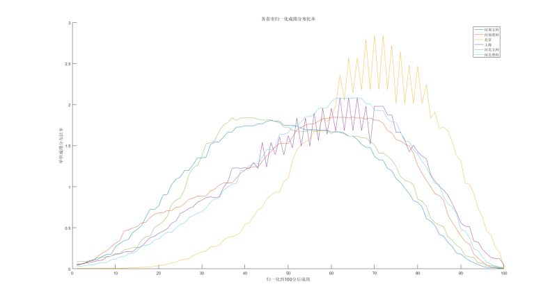 # 整理數(shù)據(jù),將各省市的成績歸一到100分之后的分布比率