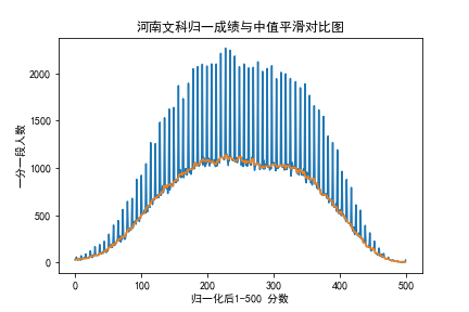 以河南文科為例, 我們直接繪制歸一化之后的成績并進(jìn)行中值濾波之后對(duì)比,
