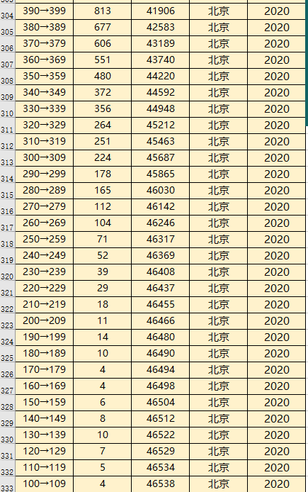 北京的人數(shù)更少,在400分以下每10分段給出人數(shù),我們?yōu)榱吮阌诜奖?默認(rèn)每個(gè)分?jǐn)?shù)平均人數(shù), 比如 390-399分段的人有813人,我們認(rèn)為每個(gè)分段都有81.3人,暫時(shí)這么處理。