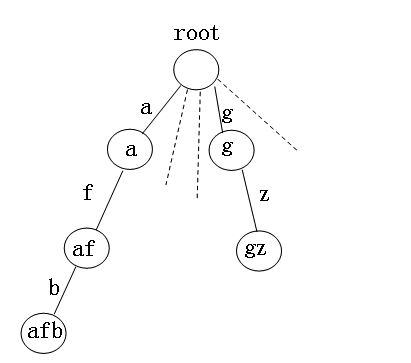 下圖為一個(gè)針對(duì)字符串排序的Trie樹(我們假設(shè)在這里字符串都是小寫字母),每個(gè)結(jié)點(diǎn)有26個(gè)分支,每個(gè)分支代表一個(gè)字母,結(jié)點(diǎn)存放的是從root節(jié)點(diǎn)到達(dá)此結(jié)點(diǎn)的路經(jīng)上的字符組成的字符串。