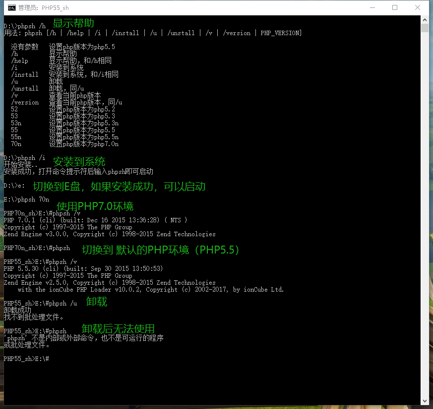 最近用php代替vbs腳本,做些小工具的開發(fā)。為了方便測試不同php版本的兼容,專門寫了一個(gè) php版本切換的 批處理 phpsh.cmd,支持安裝到系統(tǒng)、卸載等功能,還支持多個(gè)php版本的任意切換(需要先安裝phpStudy)。
