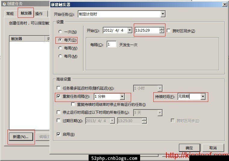 3、選擇“觸發(fā)器”選項(xiàng),點(diǎn)擊“新建”,創(chuàng)建任務(wù)執(zhí)行時(shí)間,“重復(fù)任務(wù)間隔”這個(gè)選擇后,后面有時(shí)間選擇,是每小時(shí),還是每分,可自己選擇后再修改時(shí)間,再確定。