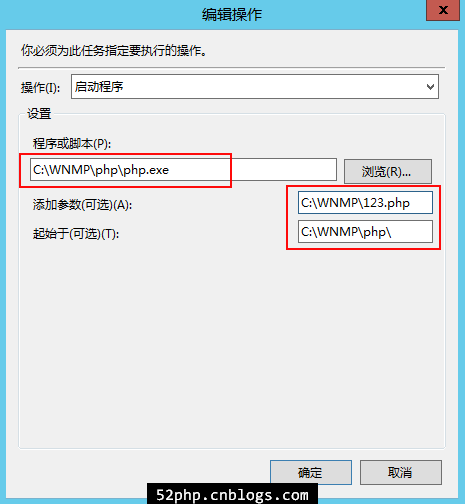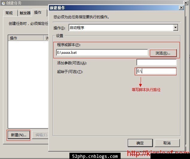 4、再來配置需要執(zhí)行的“操作”,就是選擇所寫的程序或是BAT文件,這里很重要的配置是選擇BAT文件后,在“起始于(可選)”這里一定要填寫相應(yīng)執(zhí)行程序或是BAT文件的所在目錄,要不然是執(zhí)行不成功的。