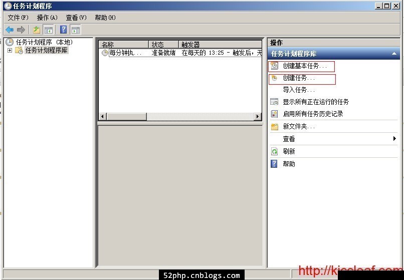 1、打開“任務(wù)計(jì)劃程序”–> 點(diǎn)擊“任務(wù)計(jì)劃程序庫”在右則會看到操作項(xiàng)里有“創(chuàng)建基本任務(wù)”和“創(chuàng)建任務(wù)”如圖所示: