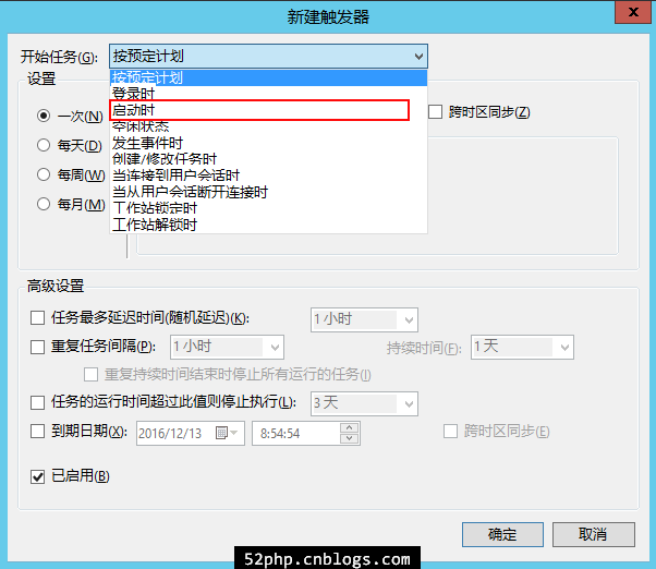 如果想開機(jī)啟動.bat文件,只要在“新建觸發(fā)器”時(shí),“開始任務(wù)”下列框選擇“啟動時(shí)”即可!