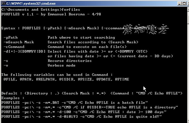 如下所示,由于Windows Server 2000下拷貝過來的forfiles命令的版本是V 1.1,使用參數必須為-p、-c、-m 而且參數后面不能有空格。