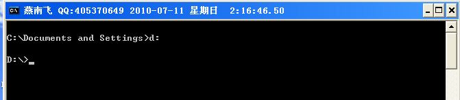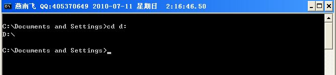 例4、如果想改變當(dāng)前驅(qū)動(dòng)器的目錄c:\documents and settings,進(jìn)入到d驅(qū)動(dòng)器默認(rèn)目錄,在當(dāng)前命令行輸入d: 執(zhí)行后結(jié)果如下圖