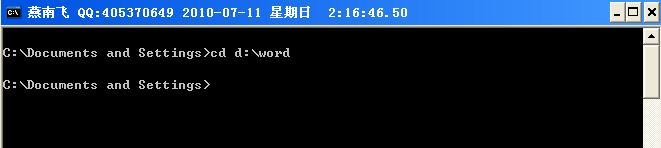 例7、如果當(dāng)前目錄是C:\Documents and Settings 要切換到 d:\word 在命令行輸入cd d:\word回車后再輸入d: 如下圖